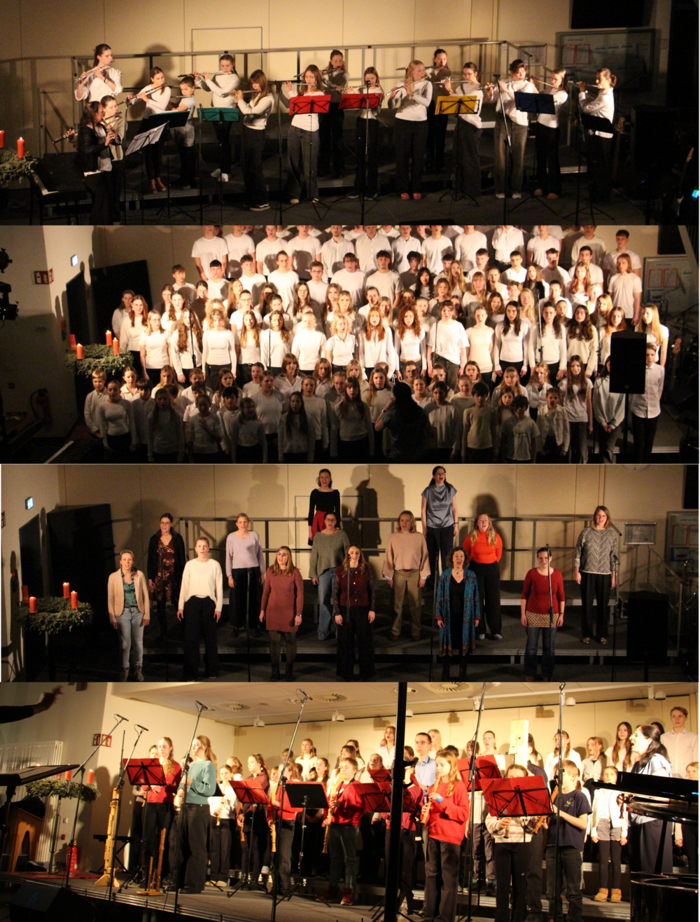 Am 18. Dezember, also kurz vor den Weihnachtsferien, fand schließlich der große und sehr breit angelegte Adventsabend statt, der im Forum etwa 500 Menschen & 150 Mitwirkende versammelte, die vielfältige Talente in einem besinnlich-festlichen Ambiente erlebten: Einzelsolistinnen und -Solisten mit Stimme und/oder Instrument und kleinere wie größere Instrumental-Ensembles von Querflöten-, Blockflöten- und Trompetenensemble bis zum Jazz-Ensemble oder der Schulband sowie Vokal-Ensembles vom kleinen Chor der Unterstufe über den Eltern- oder Lehrerinnenchor bis zum großen Chor – alle technisch perfekt abgenommen vom Ak Technik mithilfe von der Schule weiter verbundenen Ehemaligen – zeigten sie in einem bunten Programm von Klassik bis Pop und Jazz, welch großen Stellenwert und welch hohe Qualität die Musik in der DBS hat; ergänzt wurde diese Musik durch Lieder zum Mitsingen und durch stimmungsvolle Textbeiträge zum Advent, für das leibliche Wohl sorgte der 12. Jahrgang. Alle Mitwirkenden vereinten sich zum Abschluss im englischen Popsong „Christmas Blessing“, der zu „Stille Nacht“ mutierte – den stimmungsvollen Schlussakzent setzte das gemeinsame „O du fröhliche“ von Zuhörern und Mitwirkenden.