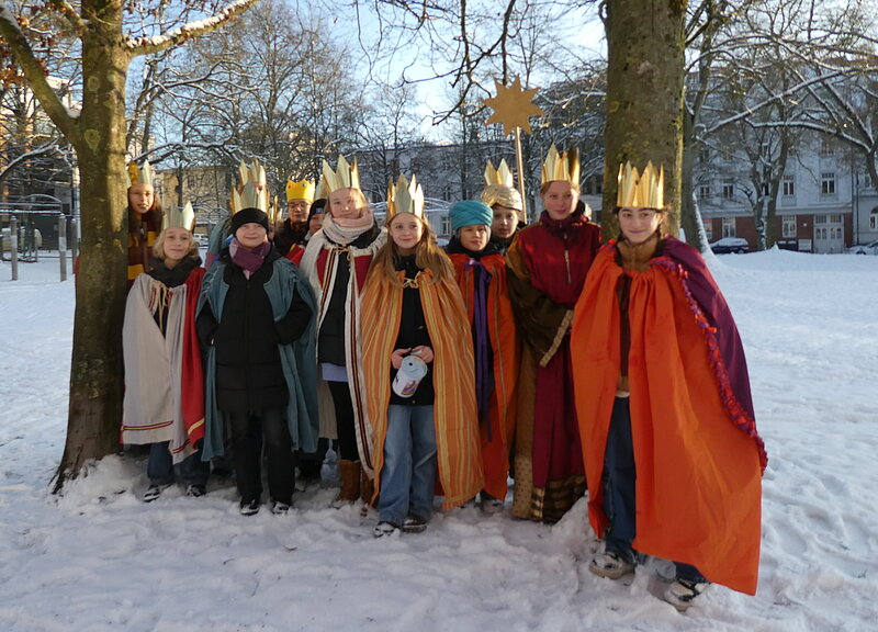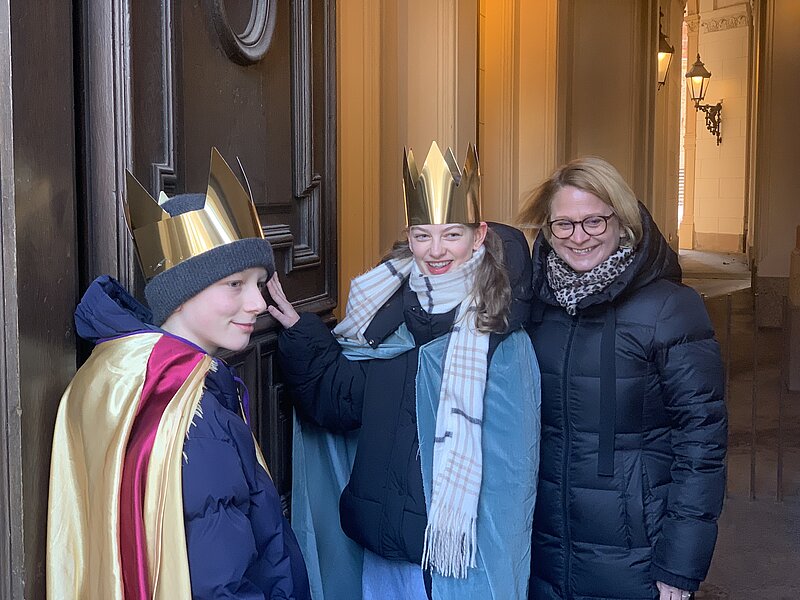 Schüler*innen bringen als Sternsinger den Segen Gottes auch außerhalb der Schule