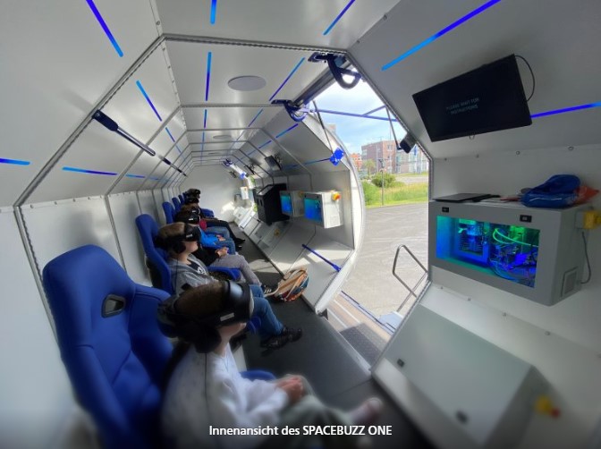 Mit dem SPACEBUZZ ONE der Deutschen Raumfahrt Agentur wird ein atemberaubender Flug ins Weltall unternommen! Der SPACEBUZZ ONE ähnelt äußerlich einer liegenden Rakete und beherbergt im Inneren VR-Technologie im Weltraumdesign. Unsere Schüler*innen werden auf den beweglichen Sitzen Platz nehmen, eine VR-Brille aufsetzen und einen virtuellen 15-Minuten-Raumflug mit den ESA-Astronauten Matthias Maurer und Alexander Gerst ins All erleben.