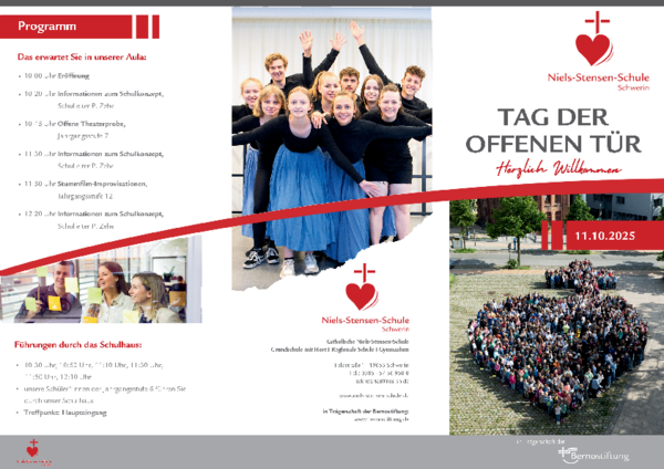 Am Samstag, 11.10.2025, öffnen sich von 10:00 – 13:00 Uhr die Türen unserer Niels-Stensen-Schule für Schüler*innen und Eltern, die die weiterführende Schule kennenlernen möchten und Interesse an einer Anmeldung für das kommende Schuljahr 2026/27 haben.