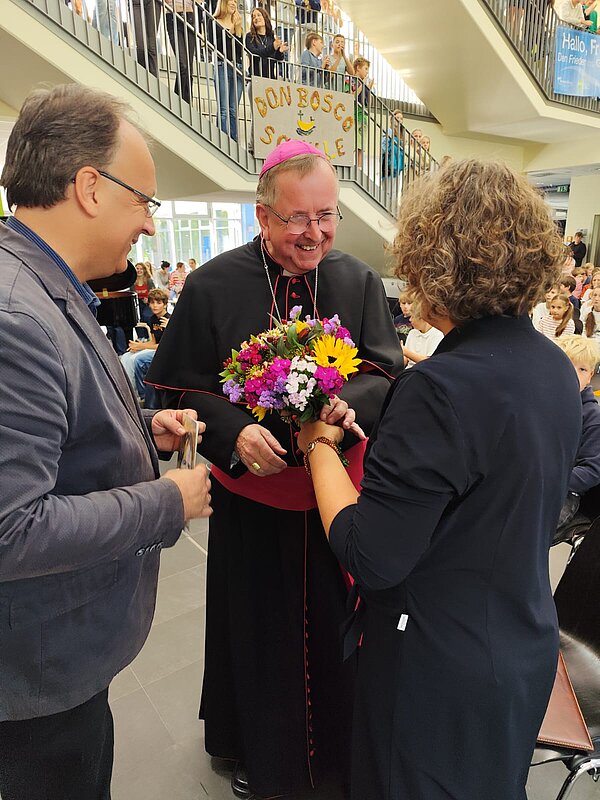 Seit 2017 ist er Weihbischof im Erzbistum Hamburg und hofft nun auf das Placet des Papstes zum in der Kirche üblichen Rücktrittsgesuch an seinem 75. Geburtstag, den er am 25. Oktober 2025 feiern wird. Gymnasialleiter Bernd Hackl, seit 16 Jahren in der Schulleitung, überbrachte zusammen mit der neuen Schulleiterin der weiterführenden Don-Bosco-Schule, Susanne Clasen, den Dank für Eberleins fortwährenden unermüdlichen Einsatz für die Menschen in Pfarrei, Schule und Erzbistum und Segenswünsche der ganzen Schulgemeinschaft.